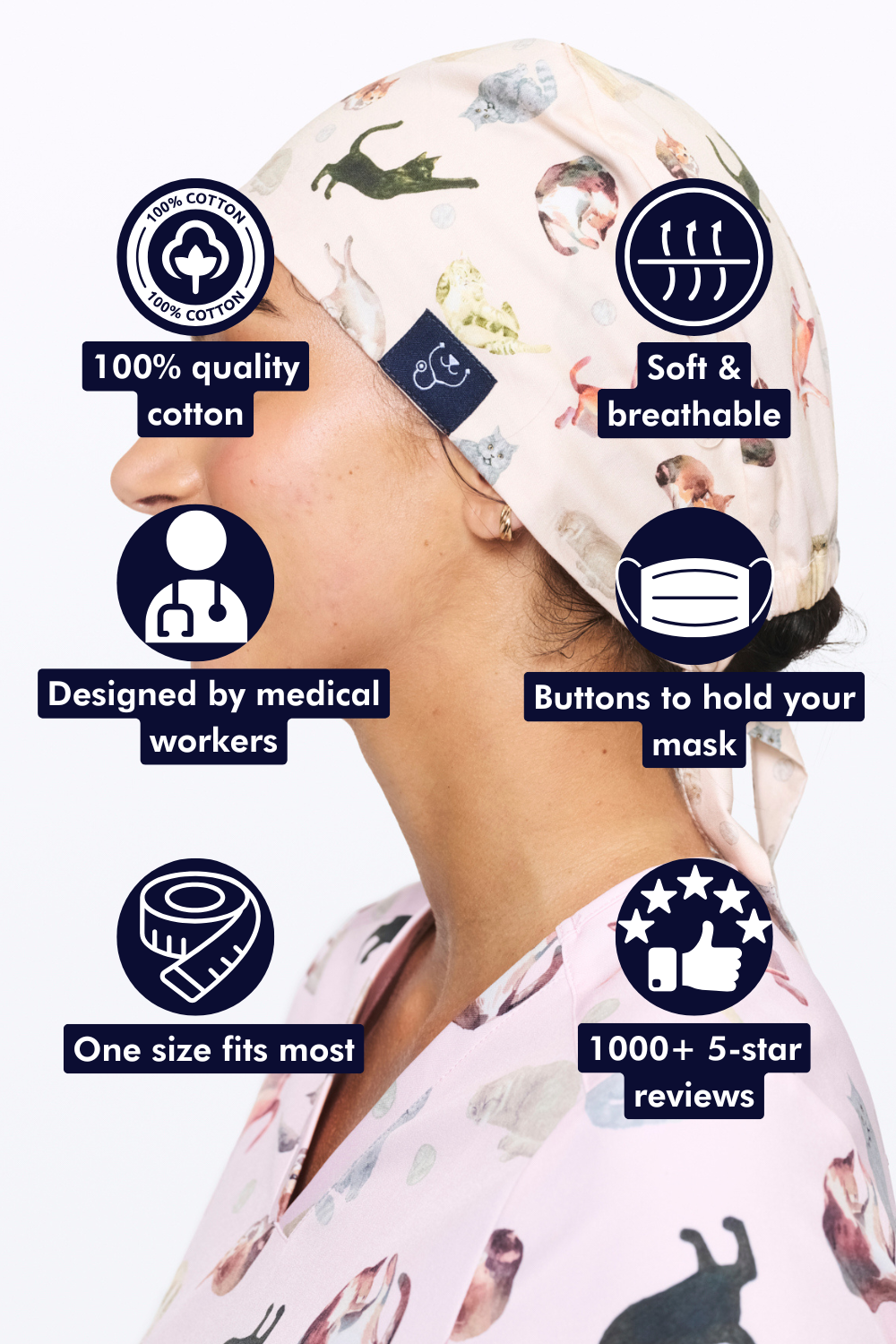 We designed these scrub caps in support of the 20,000 Australians diagnosed with breast cancer every year. 10% of the proceeds will be donated to charities dedicated to breast cancer research.