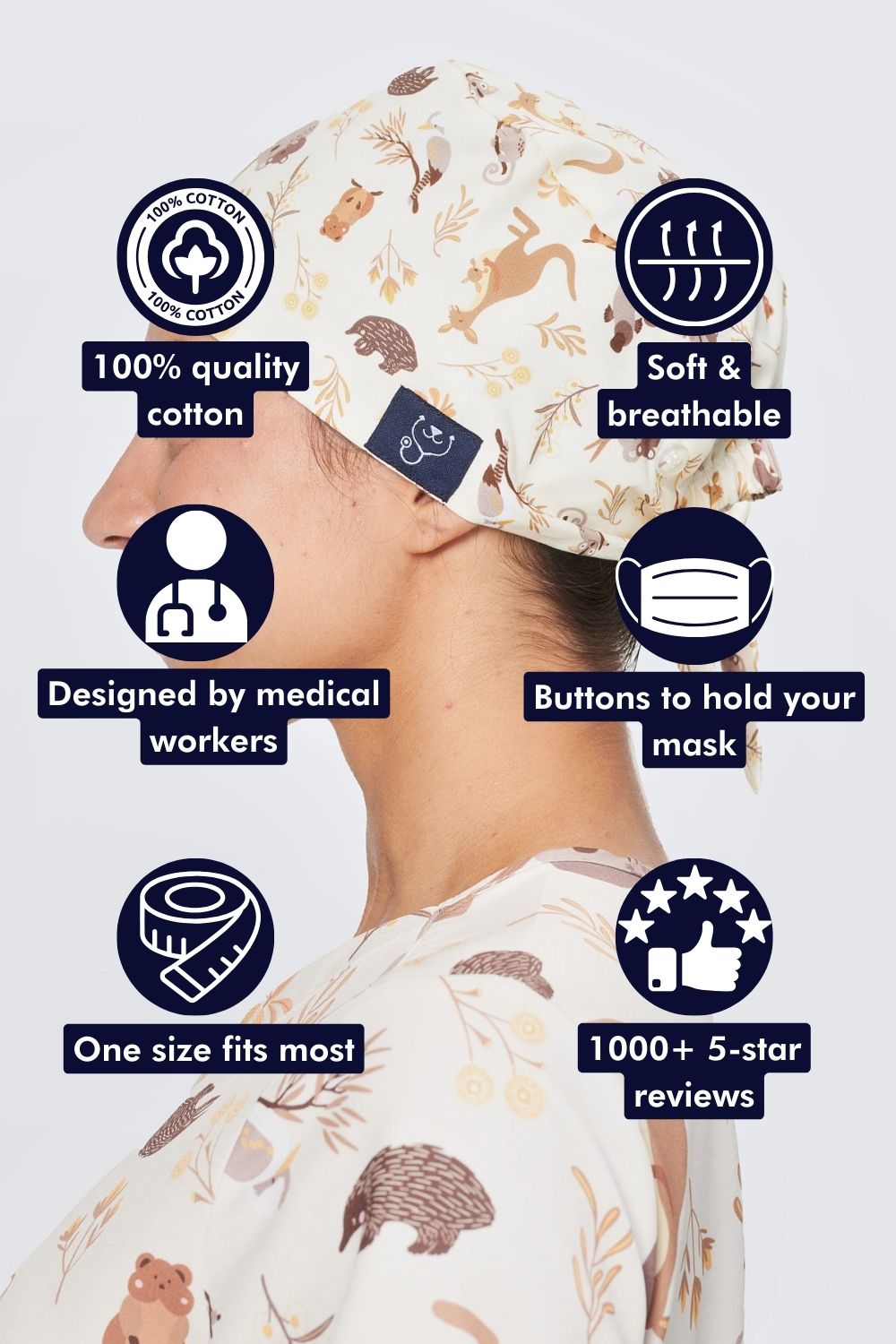 Our international friends will be happy to know that the creatures on our Aussie Natives scrub cap don’t want to kill you. Their goal (and ours) is to keep you happy and comfy all shift long. You’ll love the: