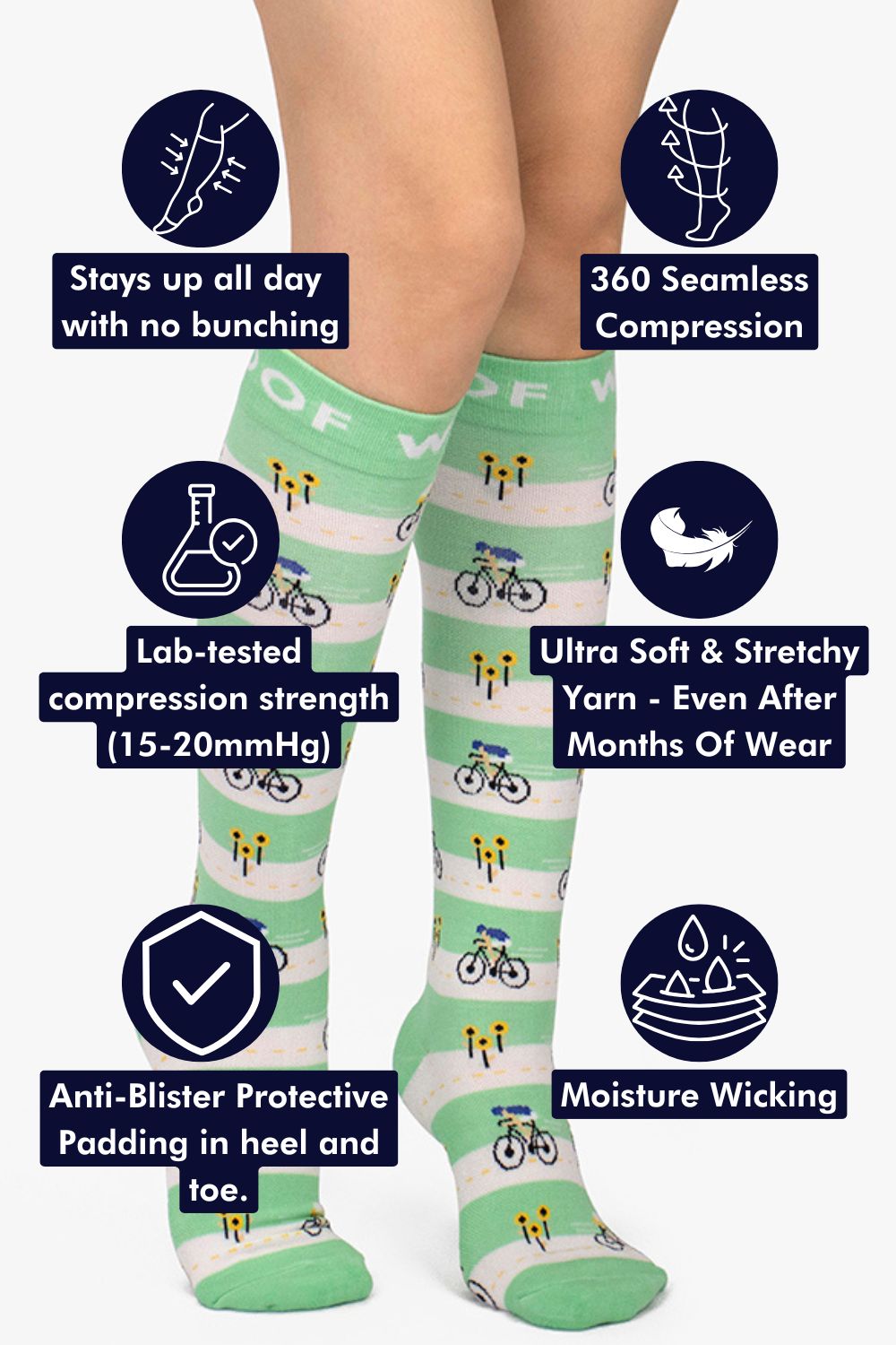 Our socks come with a whole suite of features to keep your feet happy! They offer 360° seamless compression for comfort, a medium compression level to ease your day, super stretchy fabric that hugs your feet just right, moisture-wicking technology to keep you dry, and extra cushioning in the heel and toe for that cloud-nine feeling.