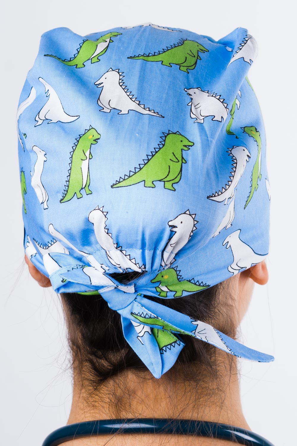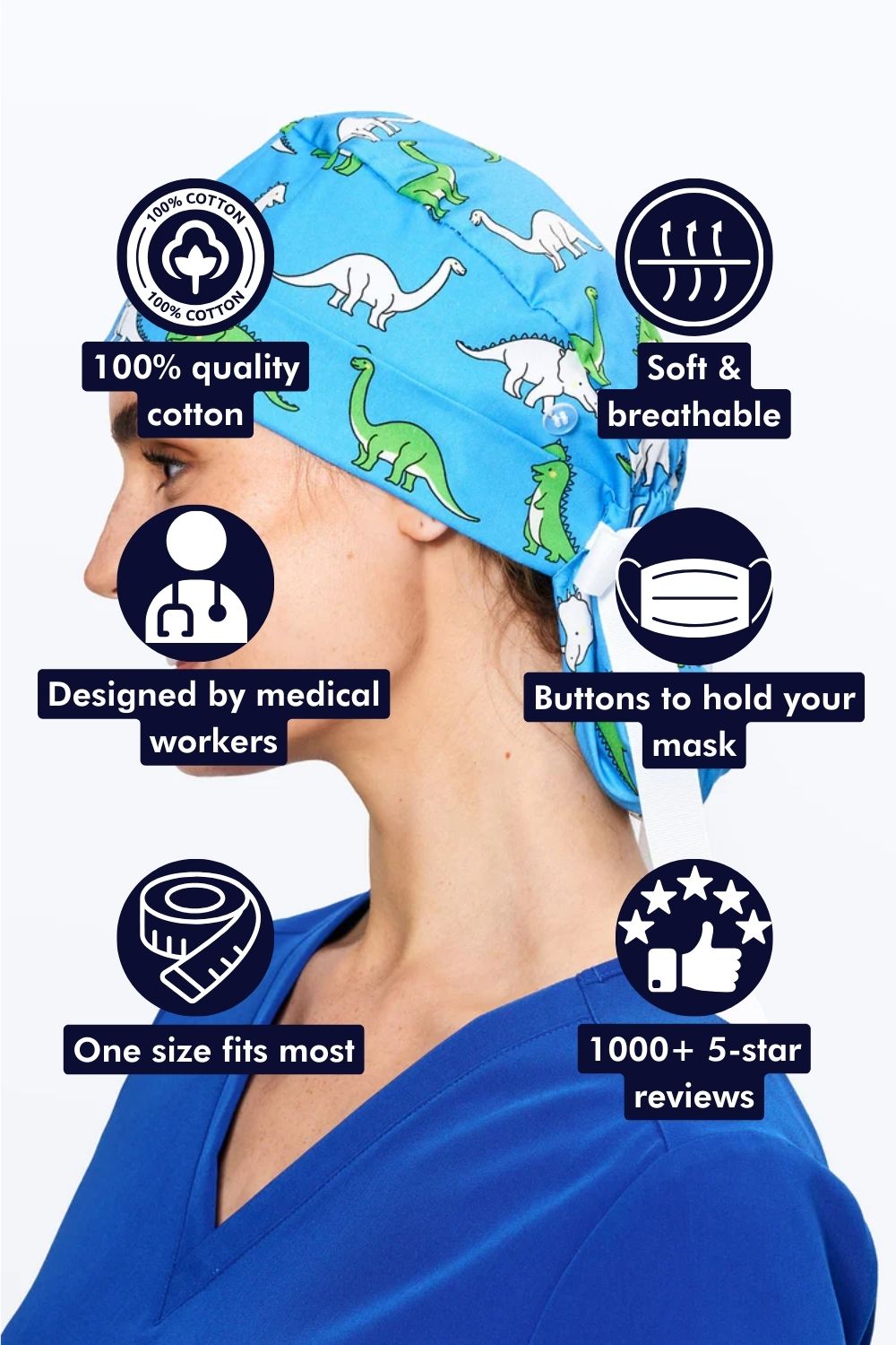 Love this Dino scrub cap! It was a tiny bit too big for my head, but very easily solved by folding up a little bit at the front. Elastic on the back helps for a snug fit, and the buttons on the side so I can attach my surgical mask without having to loop it around my ears, absolutely genius!!