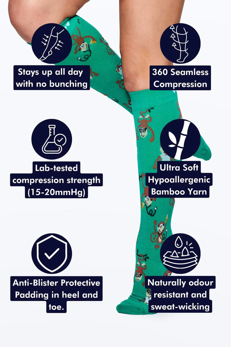 Our Monkeying Around Compression Socks combine the comfort and luxury of bamboo fabric with 360° seamless compression.