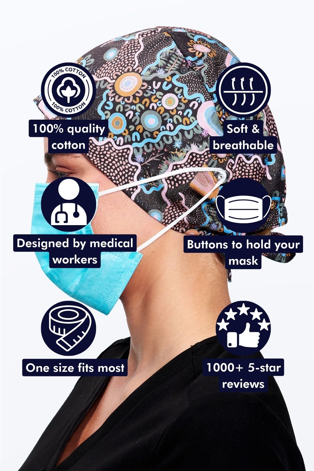 Like all our 100% cotton caps, Two Worlds Scrub Cap is:
